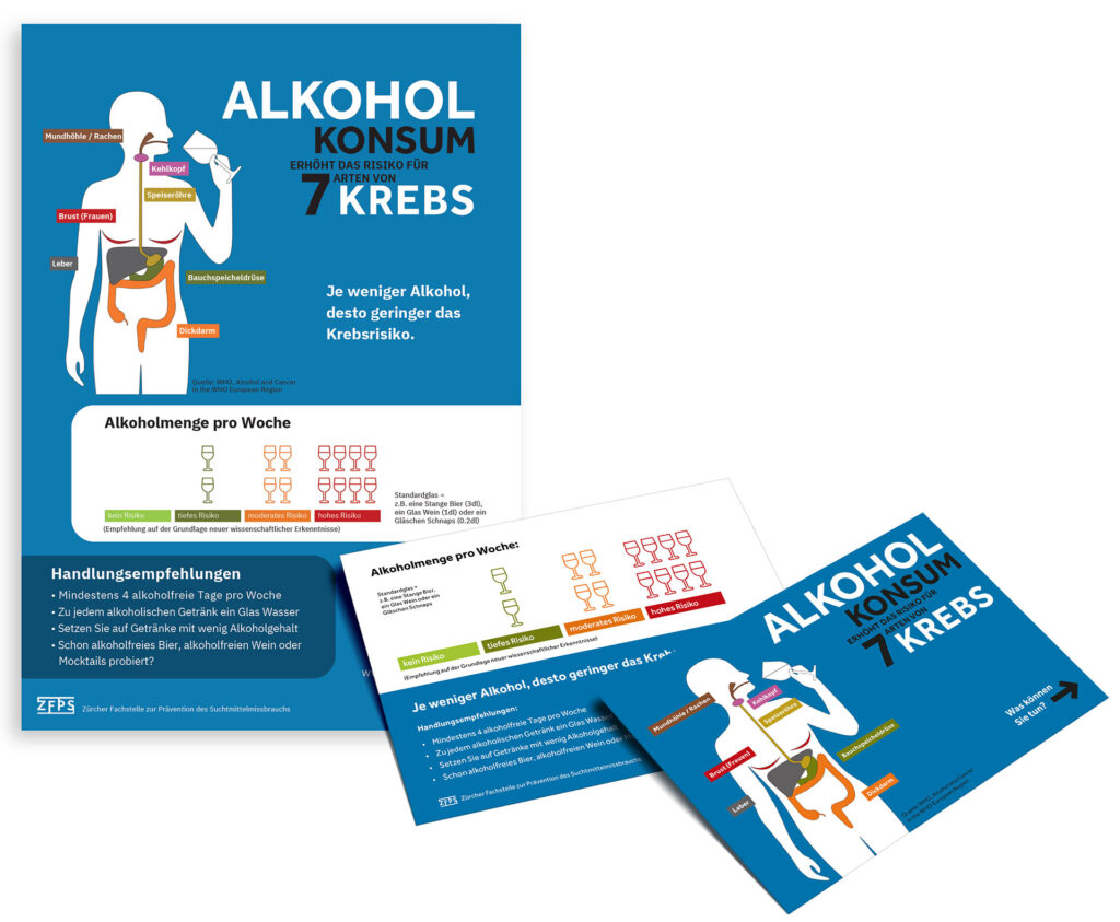 Informationsflyer und Plakat «Alkoholkonsum erhöht das Risiko für 7 Arten von Krebs»
